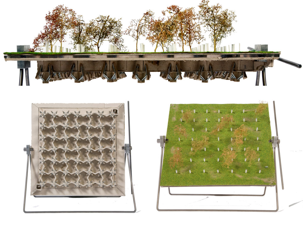 The noctural roaming is represented by the underground network of dwelling units. These units contain three levels: an above the ground light shaft, an underground cube and a sleeping shaft underneath. At the four corners of the cube the units are connected by fractured tunnels making the direct vision between the units impossible.