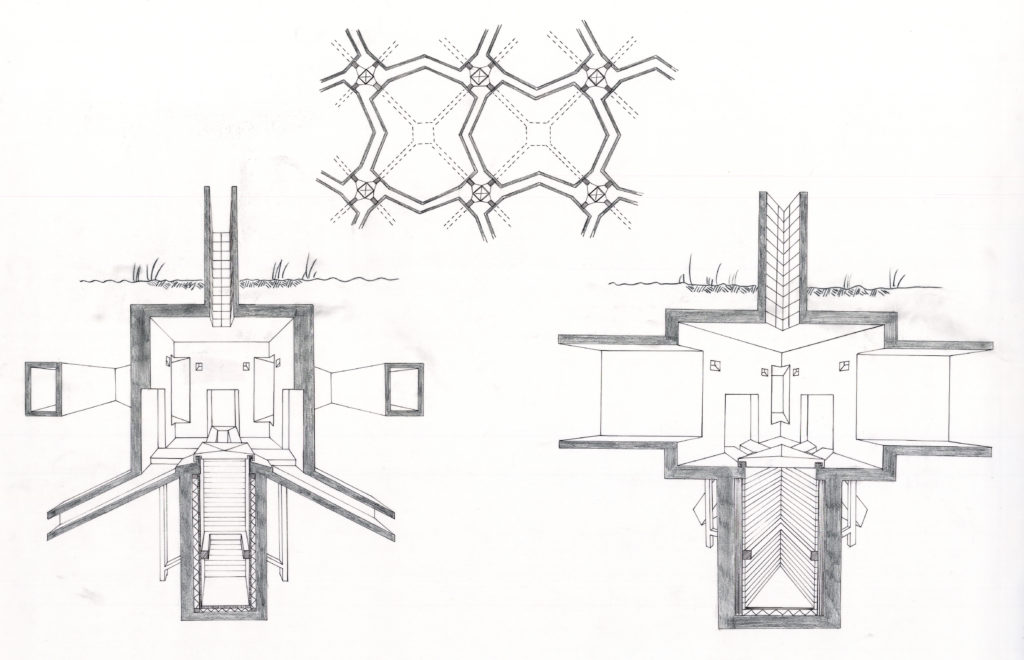 Within the cube one finds 4 shafts for the deposit of waste and faeces. In the middle of the cube there is a hatch that leads to the 2,5m deep sleeping space, which can be closed off from the inside. The units are multiplied and connected with fractured tunnels and thus giving the impression to the feeble minded of moving in circles. The only light source are the light shafts which are clad with mirrors on the inside. In order to avoid confrontation the wanderers of the underground network have to trust on their hearing.